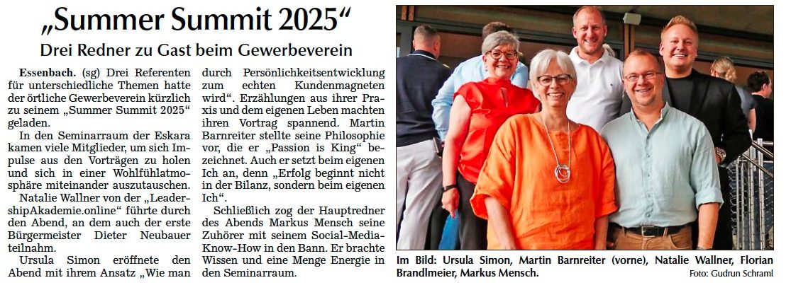 Anschrift: LeadershipAkademie.online, Wacholderstraße 10, 84051 Essenbach und Gewerbeverein Essenbach, Regensburger Straße 33, 84051 Essenbach
